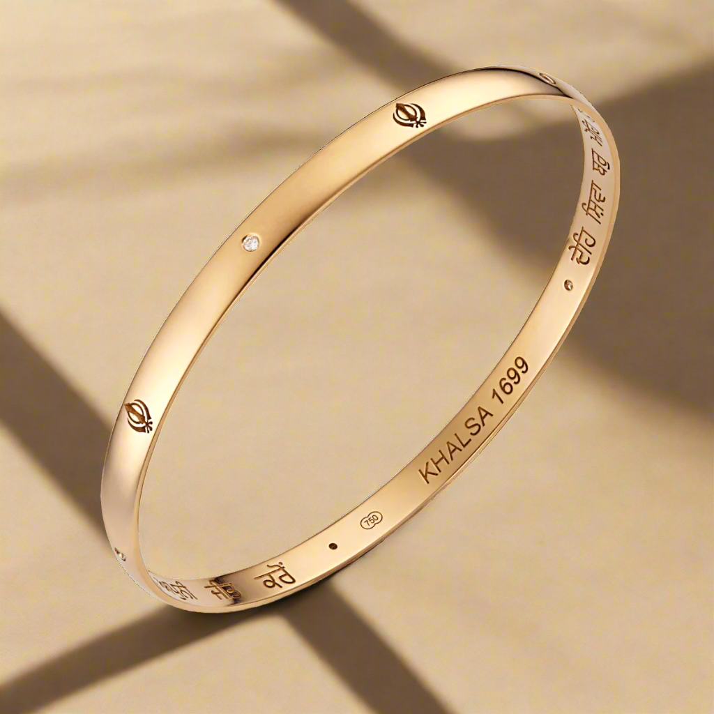 The KAUR Kara is the quintessential addition and represents 1 of our 5 Kakae ( or one of our 5 observations), the Kara. This magnificent everyday piece is 18k gold. It has 5 Khanda Sahibs on it and 5 diamonds. On the inside of the Kara is the inscription of the line from our Anthem written and composed by SHIRI Guru Gobind Singh Ji Maharaj Deh Siva Bar Mohe In Gurmukhi. This piece is a salutation of the KAUR's beauty and bravery in our culture, heritage, and history.