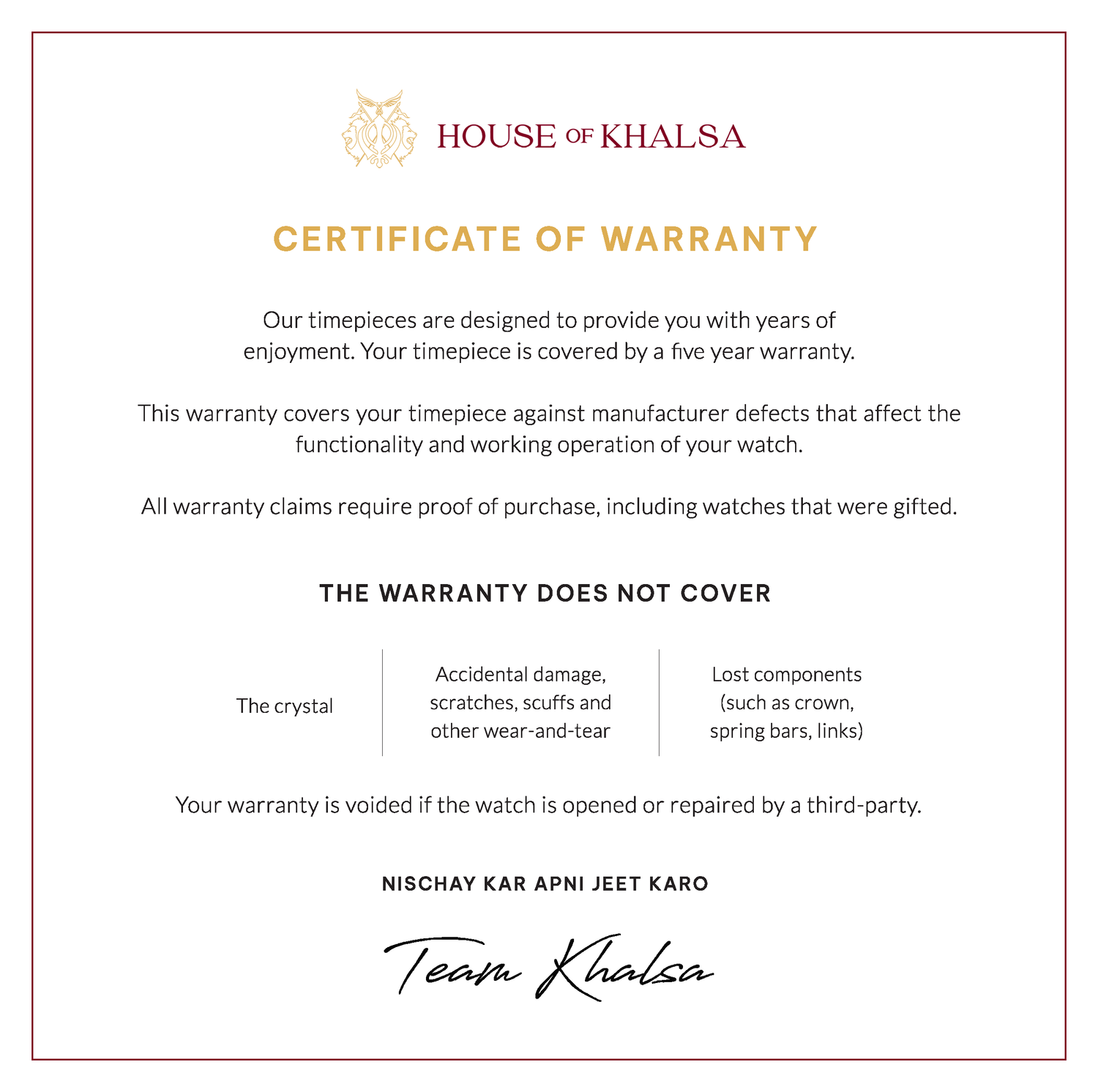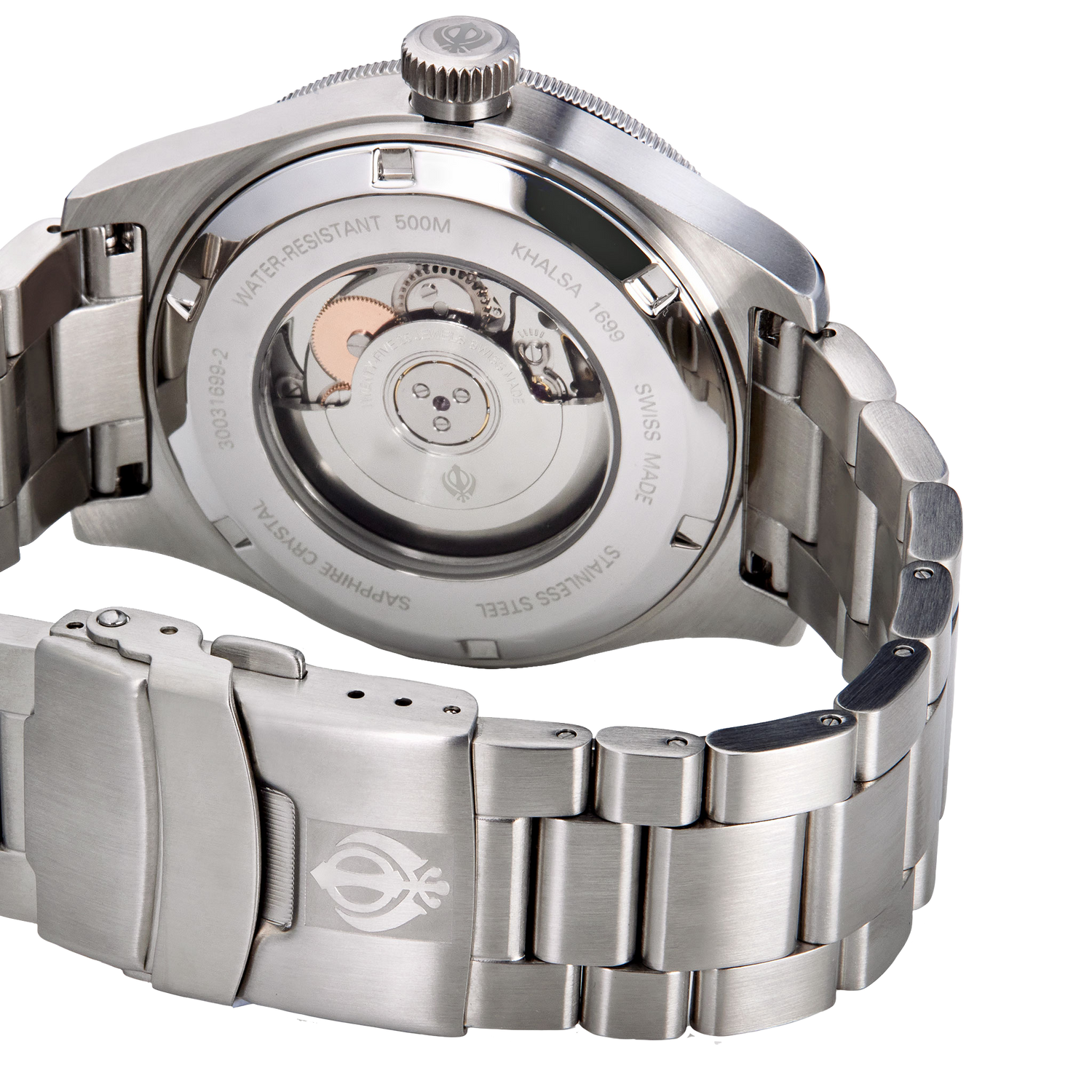 The crown features an embossed Khanda Sahib, a subtle reminder that this watch embodies the cultural significance of Khalsa