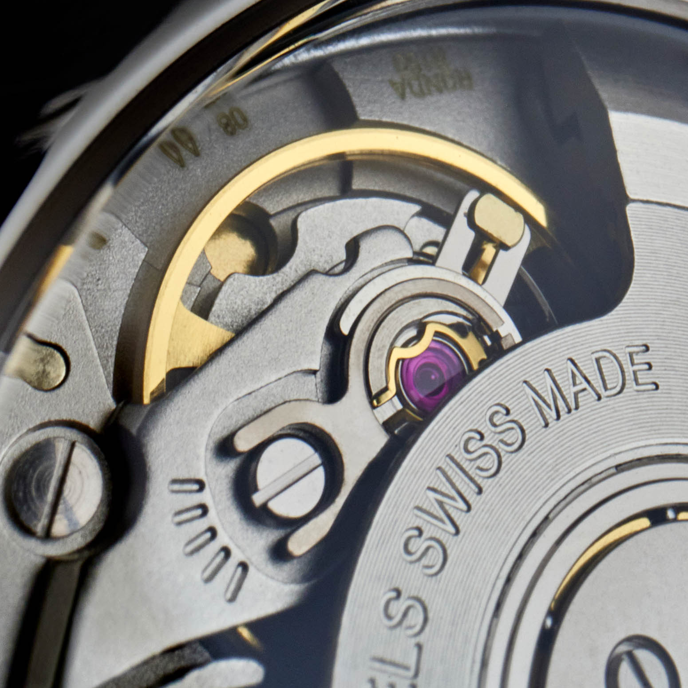 The case back features a sapphire crystal window, offering a clear view of the Swiss Automatic Movement inside. This scratch-resistant material is durable and ensures long-lasting clarity.