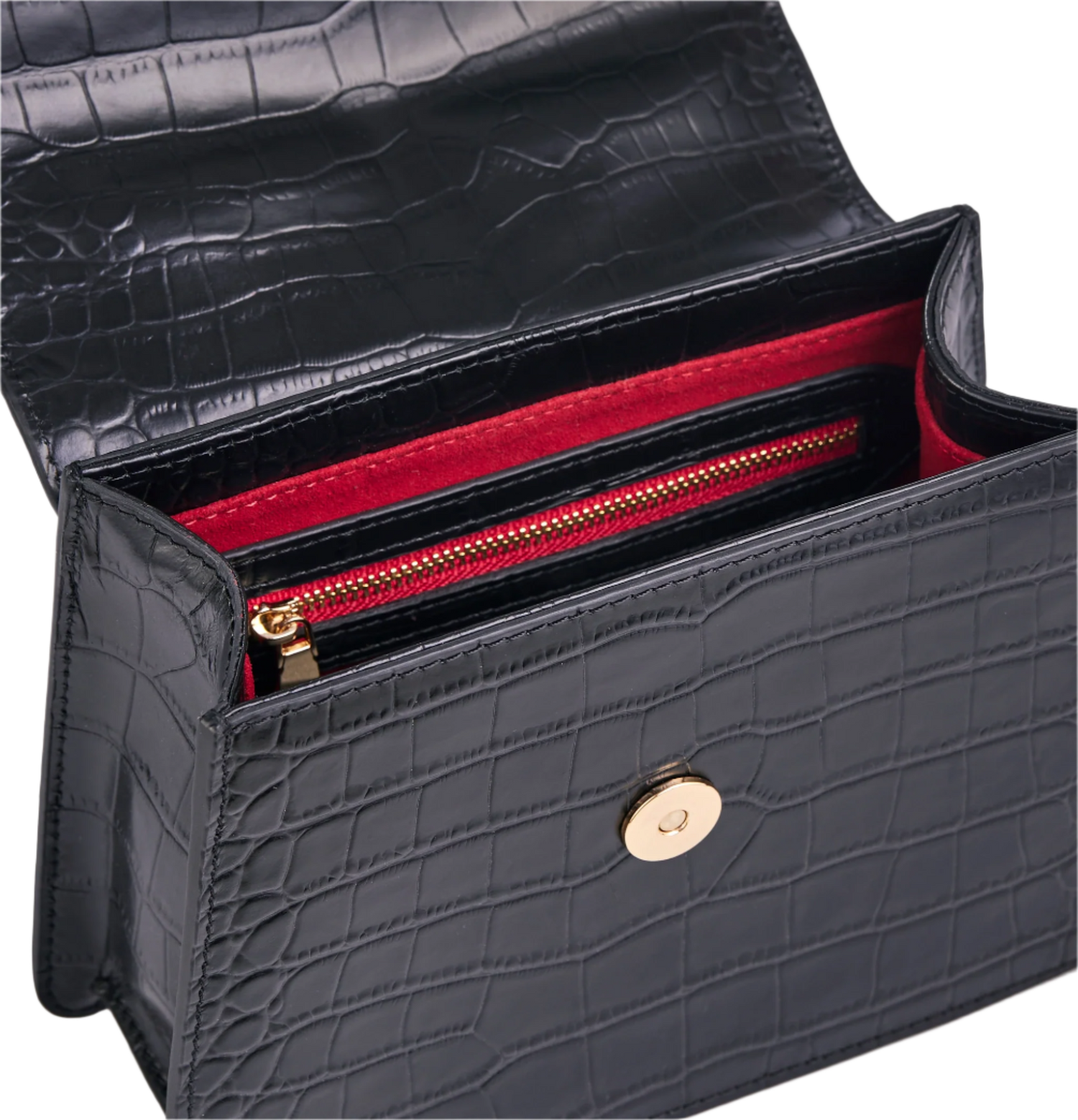 Inside, you'll discover a spacious compartment lined with velvety red and black leather, providing a lush backdrop for your belongings. The adjustable strap ensures the perfect fit, allowing you to carry it comfortably, whether you're heading to a business meeting or a glamorous evening event.