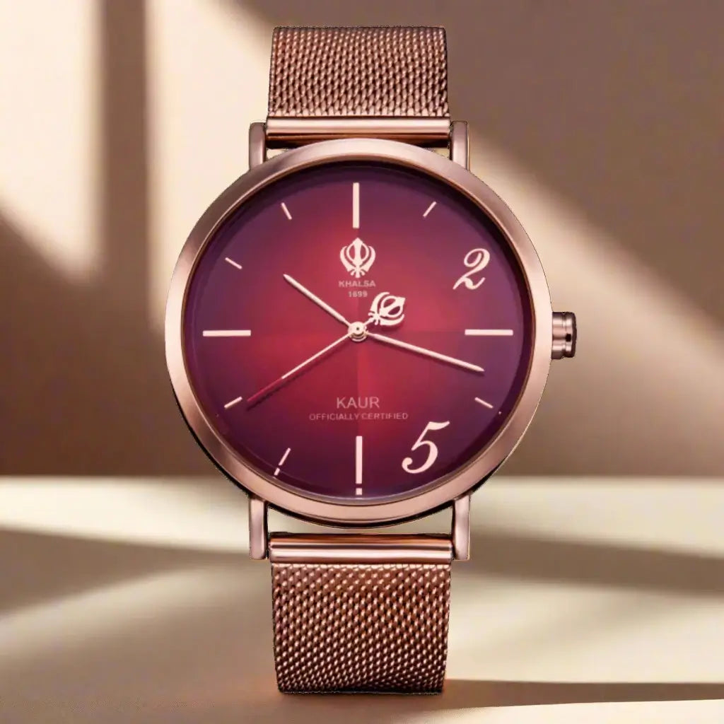 Get lost in the ombre Khanda red dial of the House of Khalsa Crimson Red Kaur. With a larger rose gold stainless steel case and mesh band, the Kaur adds a touch of class to any occasion.