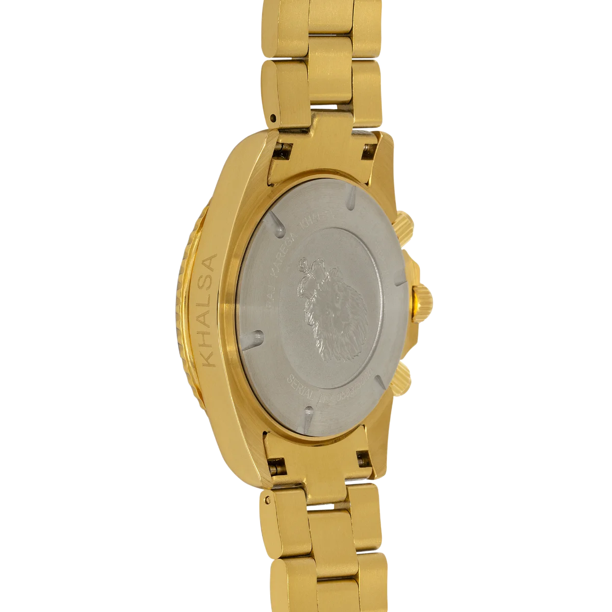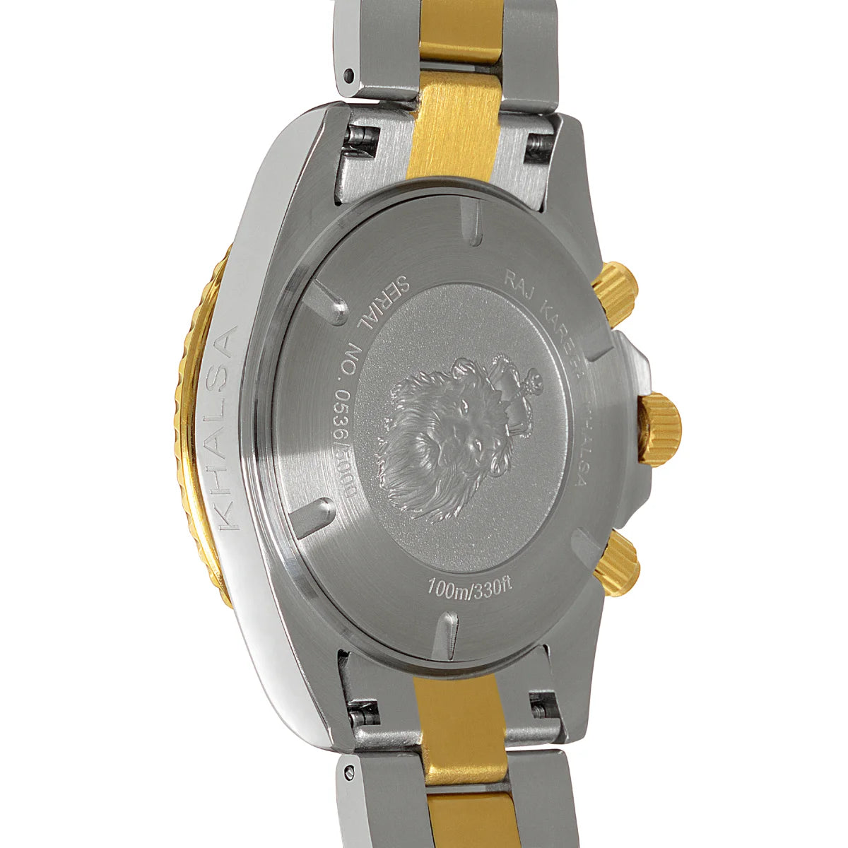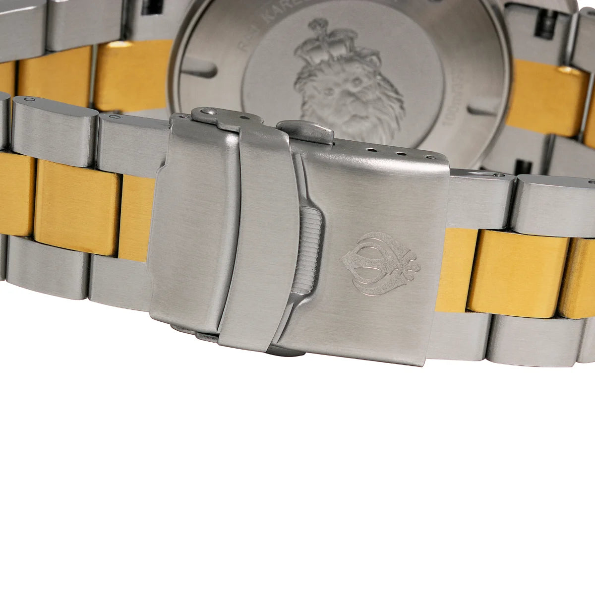 This exquisite watch features a 43 mm polished stainless steel case with a captivating two-tone finish, exuding a perfect blend of sophistication and sportiness. The deeply etched lion's head and Khalsa crown on the case back add a touch of regality, creating a watch that is as much a symbol of tradition as it is of modern design.