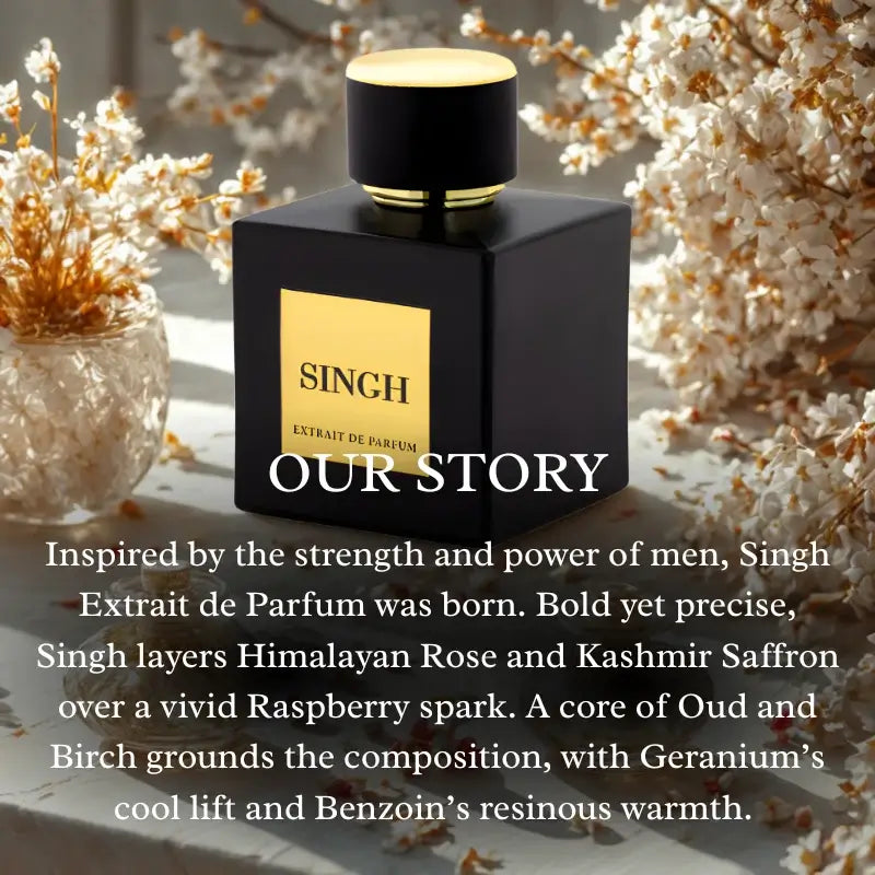 Inspired by the strength and power of men, Singh Extrait de Parfum was born. Bold yet precise, Singh layers Himalayan Rose and Kashmir Saffron over a vivid Raspberry spark. A core of Oud and Birch grounds the composition, with Geranium’s cool lift and Benzoin’s resinous warmth. Punjabi incense completes the signature—elegant, enduring, unmistakably confident.