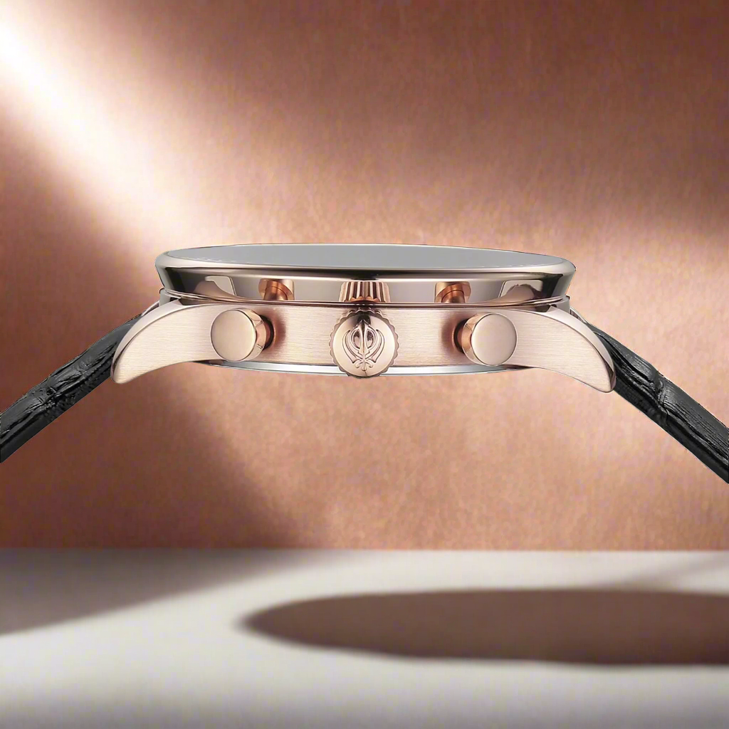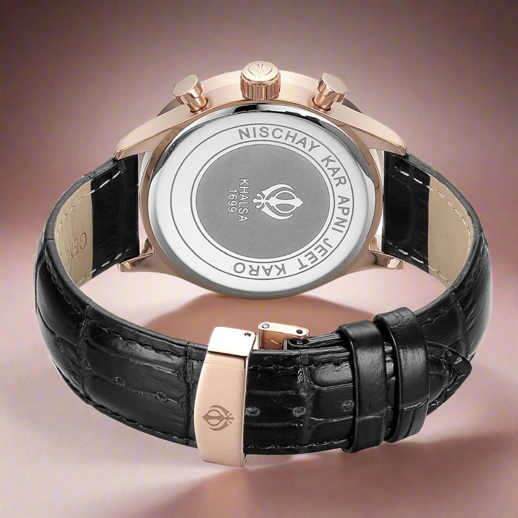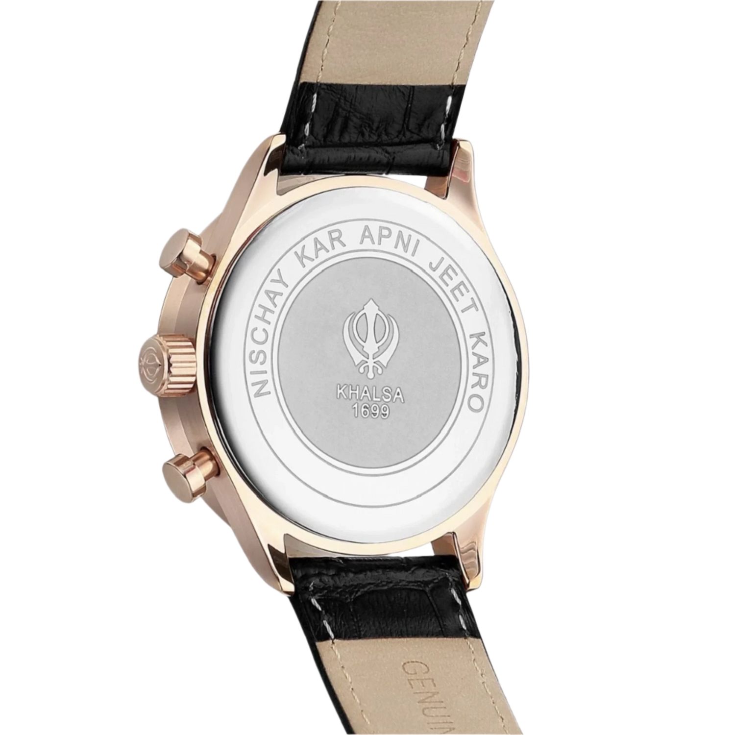 Dress to impress with the House of Khalsa Speedster Chronograph Men's Sikh Watch. This stunning watch features a Japanese quartz movement, a Khanda-stamped crown, a sunray-style dial, gold metallic numerals, a stainless steel case, and rose-gold plating.